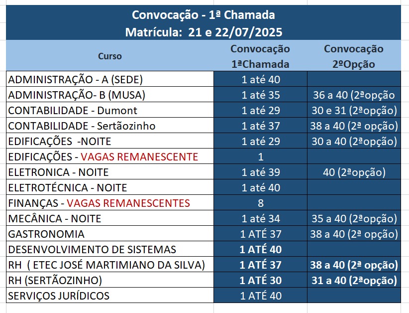 * 1ª Chamada: 21 e 22/07/2025 – 40 primeiros classificados;