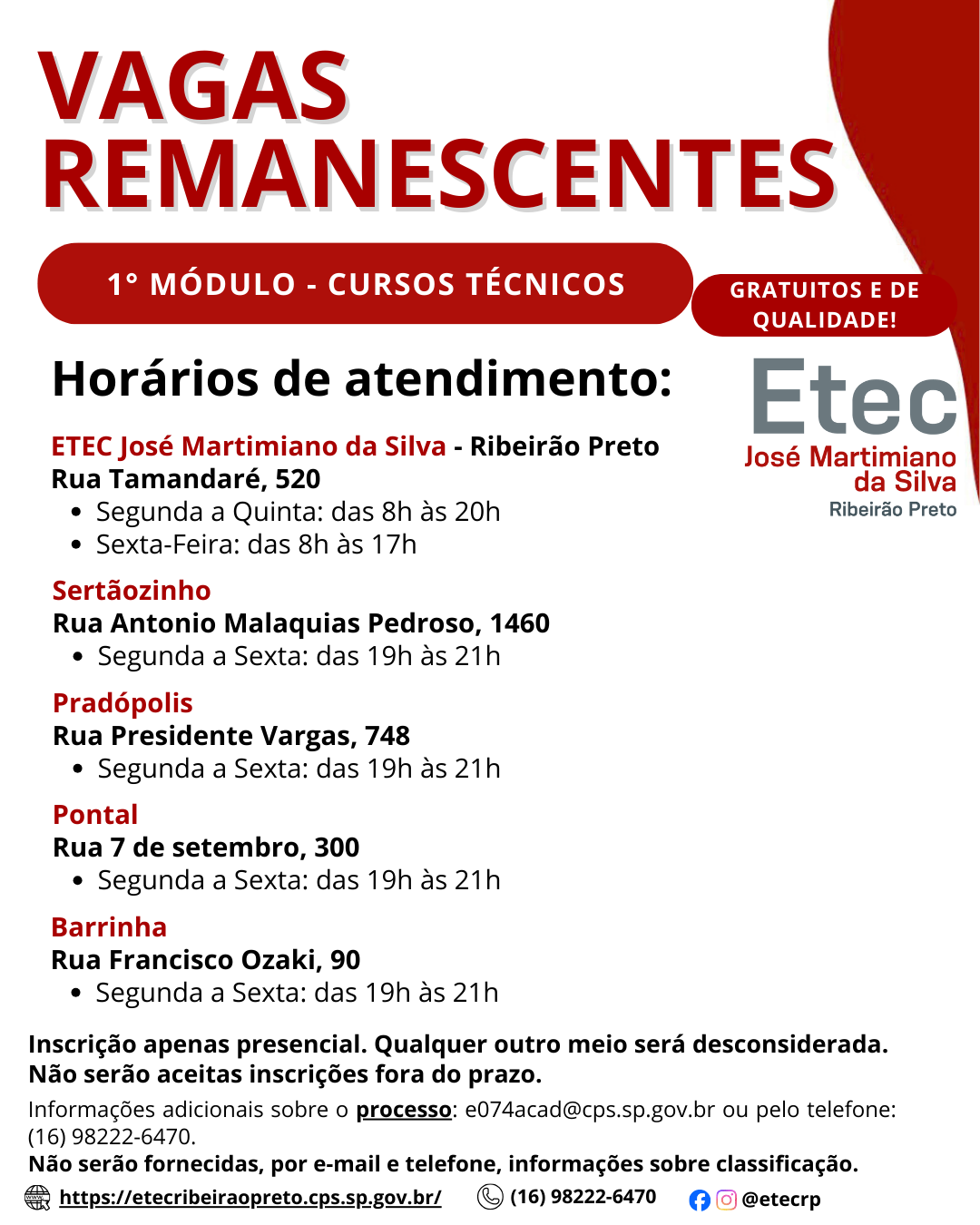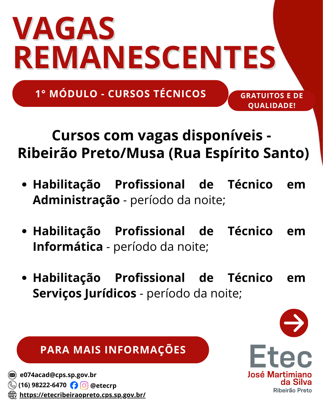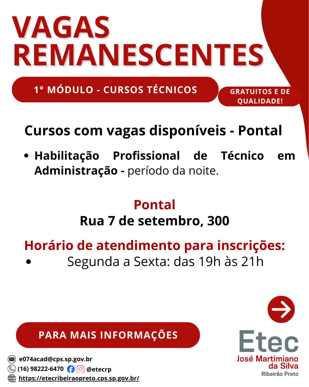 Processo de vagas remanescentes para preenchimento das vagas em aberto nas turmas do 1º módulo dos cursos Técnicos Modulares. 🎓 Cursos Disponíveis• Técnico em Administração – Tarde e Noite (Extensão MUSA), Pontal e Barrinha• Técnico […]