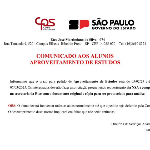 Processo de vagas remanescentes para preenchimento das vagas em aberto nas turmas do 1º módulo dos cursos Técnicos Modulares. 🎓 Cursos Disponíveis• Técnico em Administração – Tarde e Noite (Extensão MUSA), Pontal e Barrinha• Técnico […]