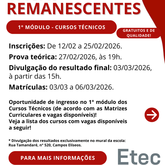 Processo de vagas remanescentes para preenchimento das vagas em aberto nas turmas do 1º módulo dos cursos Técnicos Modulares.