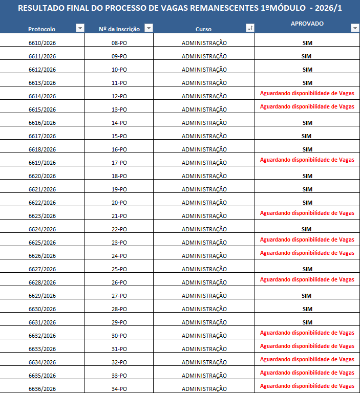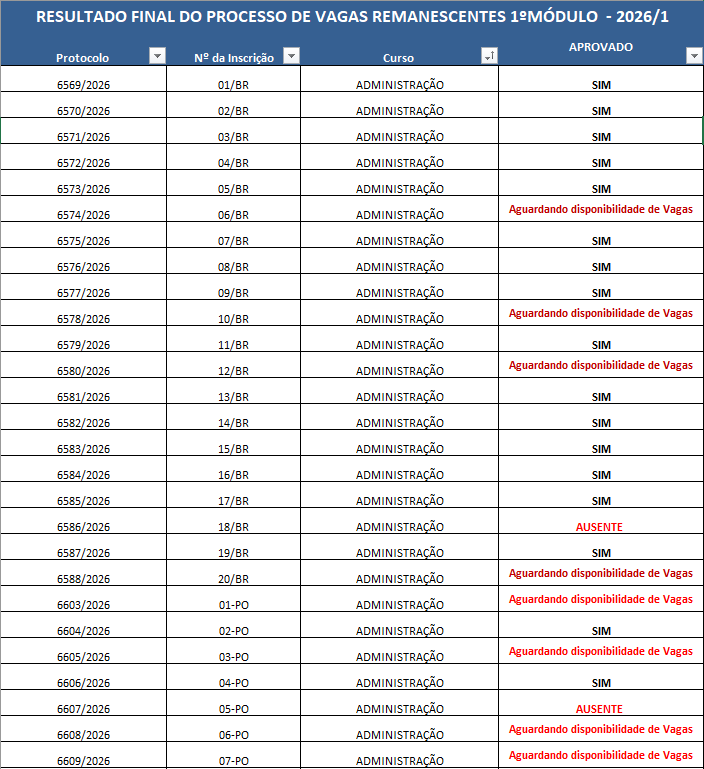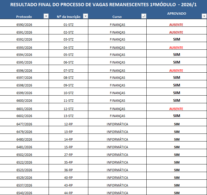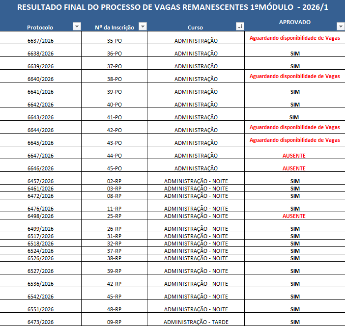 Informamos abaixo o resultado do Processo de Vagas Remanescentes para preenchimento das vagas em aberto.