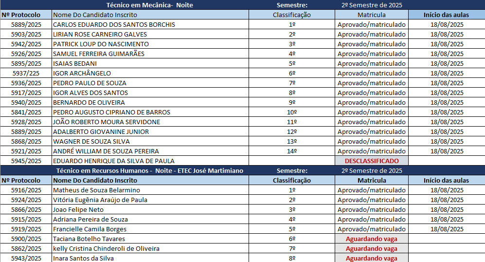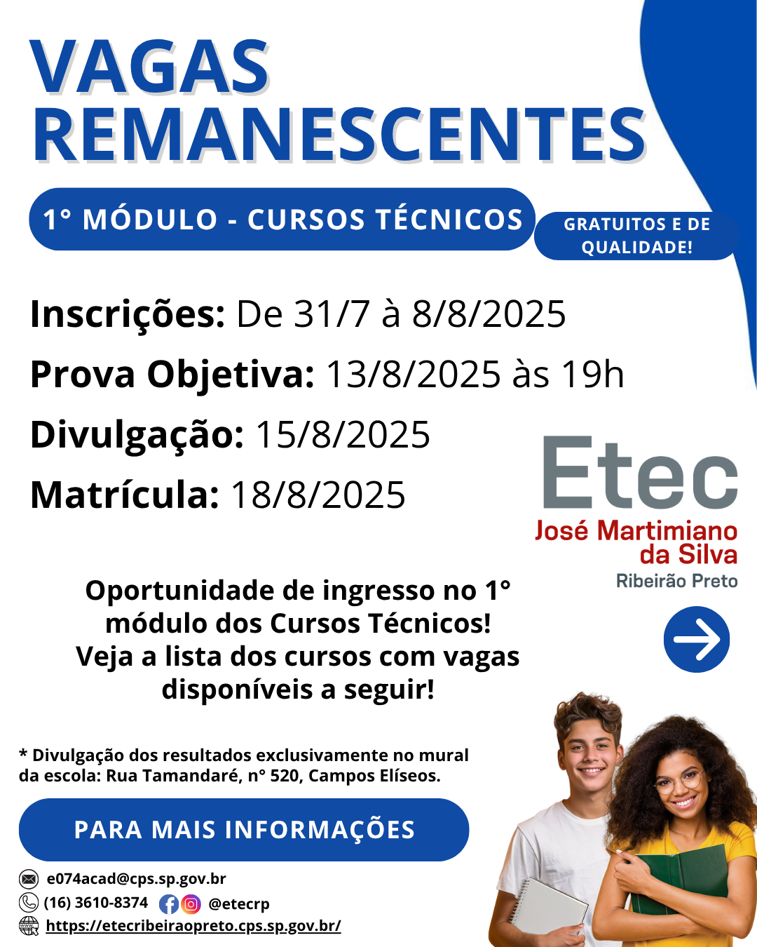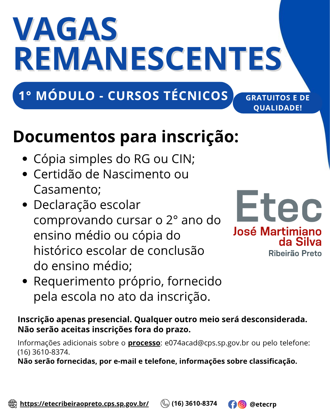 As inscrições deverão ser efetuadas pelo candidato, no período de 31/7/2025 a 8/8/2025, na Secretaria da ETEC José Martimiano da Silva, localizada na Rua Tamandaré, 520 Campos Elíseos Ribeirão Preto –SP, de segunda a quinta–feira das 08h às 11h30min, das 13h30min às 16h30 min e das 18h às 21h, e na sexta feira das 08h às 11h30min, das 13h30min às 16h30min.