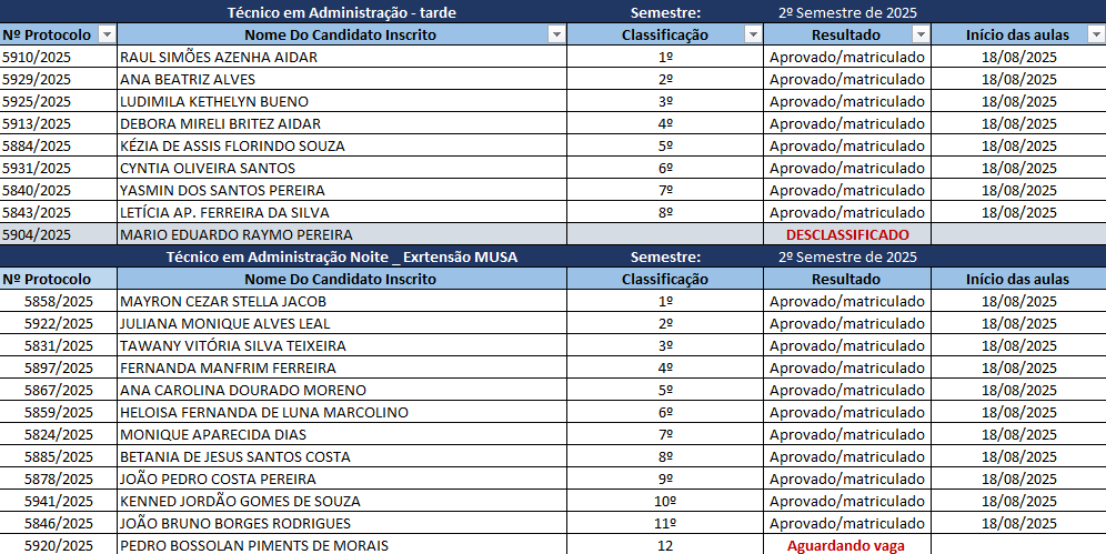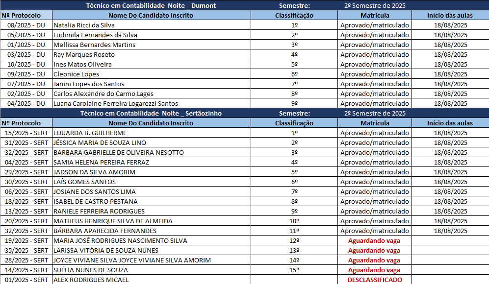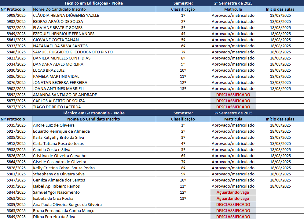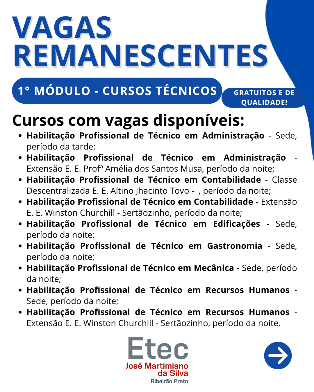 São vagas disponibilizadas nos segundos, terceiros ou quartos módulos dos cursos técnicos.
