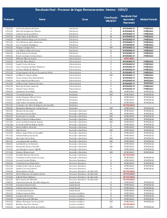 Resultado Final Vagas Remanescentes Internas 2025/2