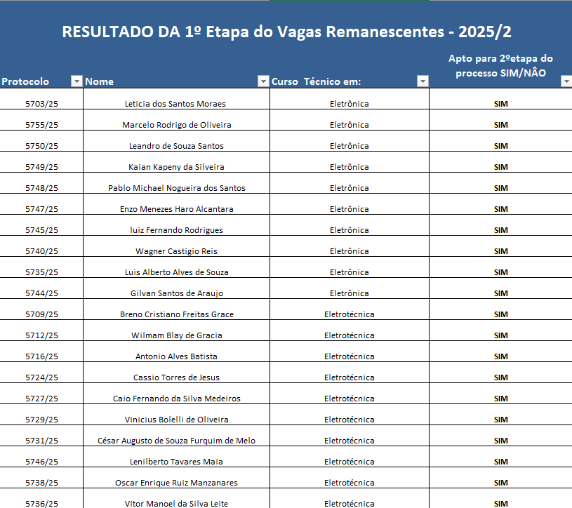Temos o prazer de divulgar o resultado final do Processo de Vagas Remanescentes Interno para o 2º semestre de 2025. Foram 69 inscritos, dos quais 58 foram aprovados para preenchimento das vagas disponíveis nas turmas modulares.